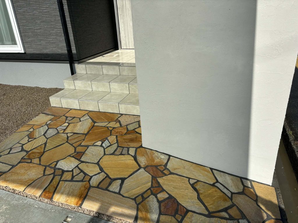 自然石ならではの質感と、ランダムに張り合わせる「乱張り」デザインが融合することで、世界にひとつだけの上質なエントランスが完成します。